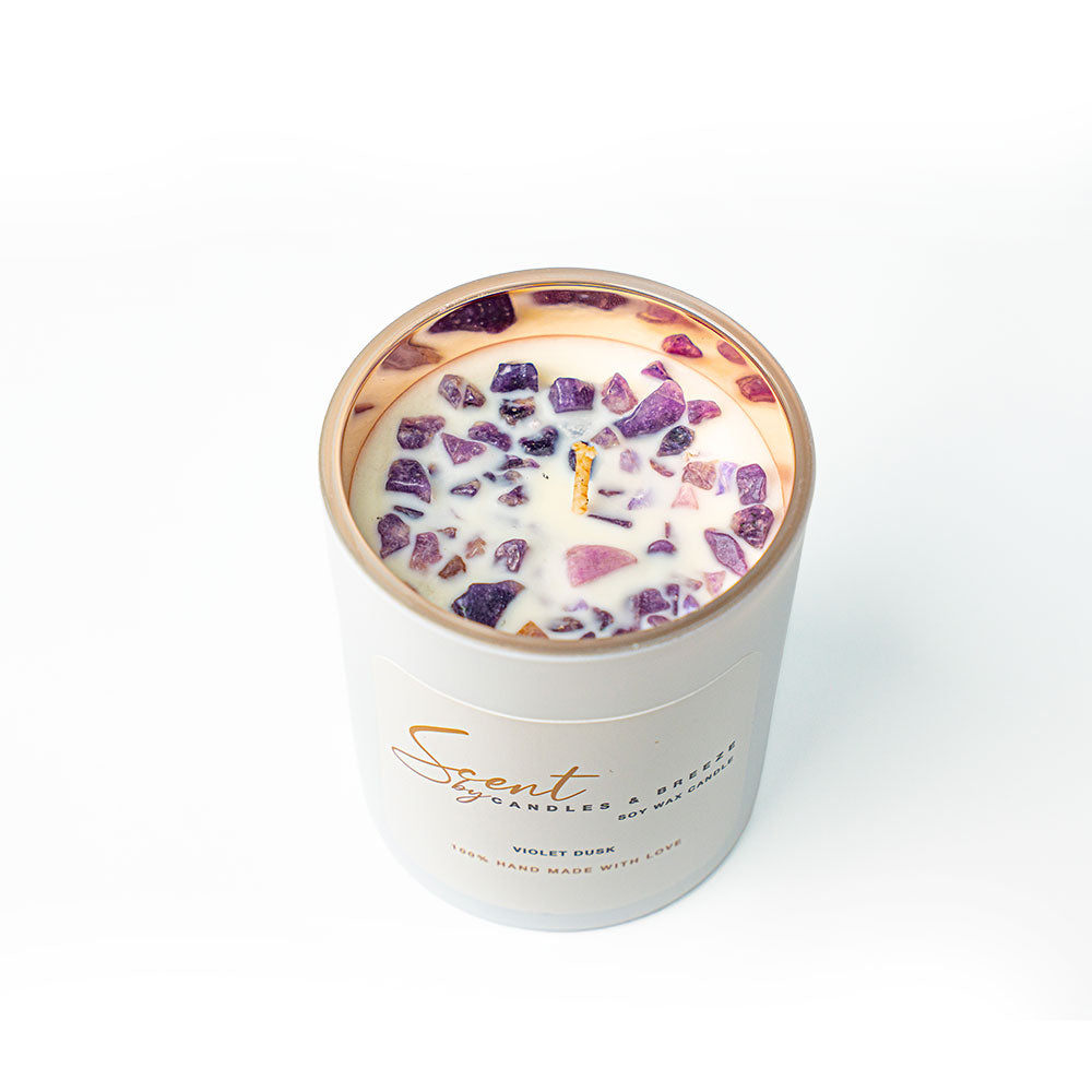 This hand-poured soy candle weaves together soft violet petals, calming lavender, and warm, earthy woods — capturing the gentle, soothing essence of evening light. Its delicate, floral warmth fills your space with a peaceful, lingering glow, perfect for slow evenings, self-care rituals, or quiet moments of reflection.